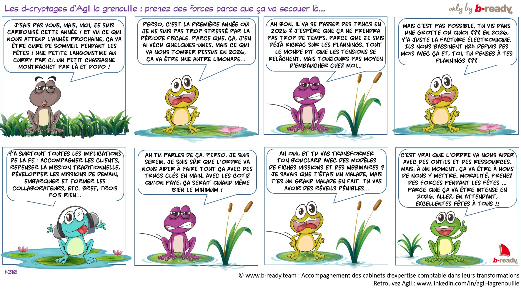 Agil et 2026 Par b-ready | 22 décembre 2025 Prenez des forces parce que ça va secouer là... Vous avez trouvé que 2025 était une année bien chargée ? Vous allez adorer 2026... Mais, bon, d'ici là, joyeux Noël et excellentes fêtes de fin d'année à tous ! Publié dans B-AGIL !
